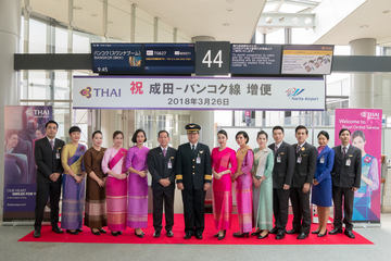 タイ国際航空、成田~バンコク線を1日4便体制に。ゲートで増便セレモニー実施