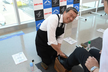 スターフライヤー、松石社長と社員が笑顔で「靴磨きサービス」のおもてなし