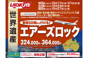 JTB、全行程チャーター便の成田/名古屋/関空発着の「世界遺産エアーズロック」発売