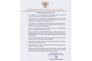 インドネシア共和国観光省が地震の影響を発表。「ロンボク島とバリ島の観光は現在平常通りの運営体制」