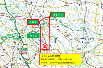 NEXCO東日本、8月31日9時から常磐道・上り線の谷和原IC~柏IC間で通行止め
