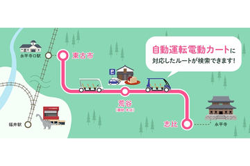 KDDIとナビタイム、ナビのルート案内に永平寺町の自動運転電動カートを追加
