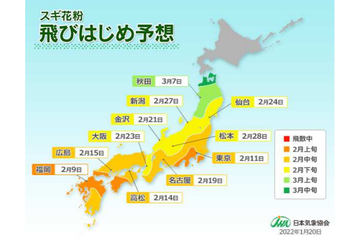 日本気象協会、2022年春の花粉飛散予測第3報。2月上旬に九州/四国/中国/東海/関東の一部から花粉シーズンがスタート