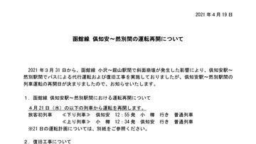 JR北海道、函館線 倶知安~然別線を4月21日午後に運行再開