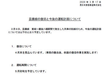 JR西日本、芸備線の東城駅~備後落合駅間での運行再開は5月初旬の見通し