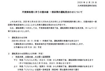 JR九州、不発弾処理作業の影響で3月8日に日豊本線の一部区間で運転見合わせ