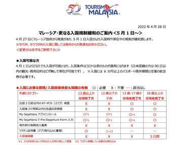 マレーシア政府、5月1日入国分から規制緩和。入国条件はコロナ以前のものを適用