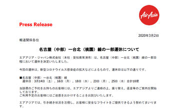 エアアジア、3月20日~4月24日のセントレア~台北(桃園)線を運休に
