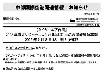 タイガーエア台湾、台北・桃園~セントレア線を9月2日に運航再開。週5便運航に