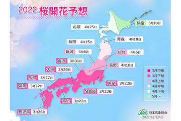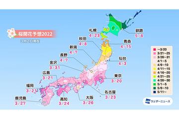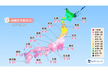 ウェザーニューズ、2022年「第三回桜開花予想」発表。桜開花トップは東京で3月19日