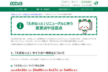 「えきねっと」大規模リニューアルに伴い6月26日20時~27日5時にサイト停止