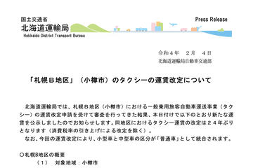 北海道小樽市のタクシー運賃値上げ。24年ぶり改定。3月10日から