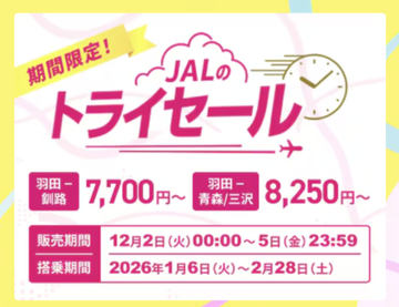 JAL、ブラックフライデーセールで国内線7700円~。総額110万マイルが当たる抽選も