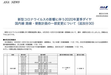 ANA、4月28日までの国内線減便など発表。一部路線で運休も