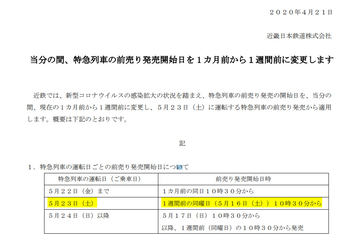 近鉄、特急券の前売り発売を1週間前に変更。5月23日出発分から