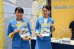 バニラエアとSpring Japanブースでは、現役の女性CA(客室乗務員)が対応していて、華やかさを添えていた。