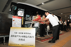西日本ジェアールバスは8月1日、大阪駅JR高速バスターミナルにおいて、大阪~金沢間の昼行特急バスに新しく導入した新型車両「北陸道グラン昼特急大阪号」の出発式を行なった。