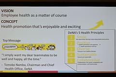 DeNA(ディー・エヌ・エー) Corporate Wellness Specialist 平井孝幸氏は、同社の紹介を行なったあと、開発者が数多く所属する同社の特色を紹介。いかに開発者に健康に興味を持ってもらうかに苦労しているという。