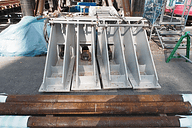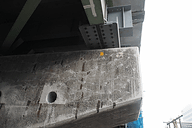 梁が残った橋脚は、ジャッキで支えるための台を極太のシャフトとナットで結合するため、穴があけられた状態。このあと、ジャッキで支えた状態をワイヤソーで切断する。切断したあとはジャッキごとスライドさせて、クレーンでトレーラーに積み込み、現場から運び出す。