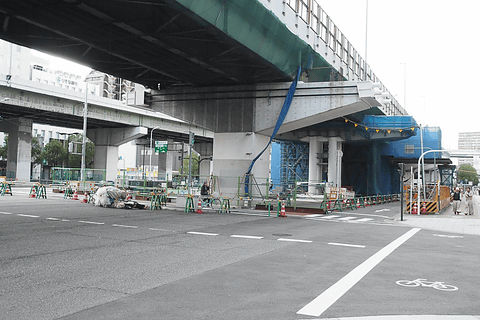 現在、橋脚の再構築などを行なっているが、問題のない橋脚から梁の拡幅工事を実施しており、なにわ筋の上の桁はすでにかけられている。今後は準備ができたところから順に橋桁がかけられていくという。