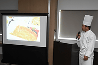 工場見学を終えると3階へ戻り、機内食を考案・調理した4人のシェフが参加者に紹介された。和食のシェフは川村博之氏と坂東泰男氏、洋食のシェフは伊藤克敏氏と中嶋裕幸氏。