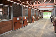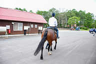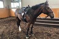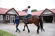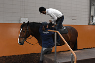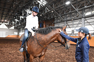まずはインドア乗馬場で、馬に跨がるところから。階段状の乗り場を使って馬の背に高さを合わせて、鐙(あぶみ)に足を通す。ここでは手綱の握り方、馬の歩かせ方(歩き始め方・止まり方)、方向の指示の仕方などを学ぶ。一通り理解したら早速外の散策へ。
