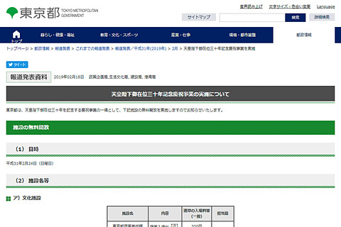 東京都は2月18日、天皇陛下ご在位30年を記念する慶祝事業の一環として、2月24日に都内19施設の無料開放を実施することを発表した。