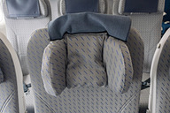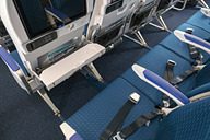 シートは背もたれを薄型化した新設計のものを採用。ヘッドレストはプレミアムエコノミーと同様の仕組みで、中央の下部を手前に折り曲げられる「6-way」タイプを採用。上下、左右の調整は一般的なヘッドレストと同様だ。さらに、足元には前席側にフットレストを備える。