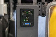 電源は各席にユニバーサルACコンセントとUSB充電ポートを装備。最前列席は上位クラスで使われているようなACコンセントとUSB充電ポートを一体化したユニットを自席側足元に用意。通常席は前方席足元側にユニバーサルACコンセント、シートモニターの中央下部にUSB充電ポートと分散して配置されているという違いがある。