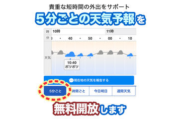 ウェザーニューズは、スマートフォン向けアプリ「ウェザーニュース」で提供していた有料機能「5分ごとの天気予報」の無料化を発表した。