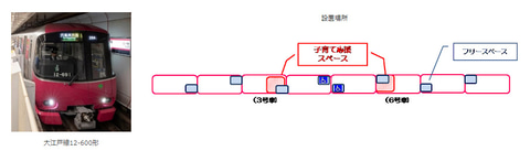 子育て応援スペースは2019年から都営大江戸線で運行を開始したもので、小さな子供連れの乗客が気兼ねなく利用できるよう、「きかんしゃトーマスとなかまたち」を使用した装飾を施したスペースを3号車と6号車に設置。これまでに7編成を運行している。