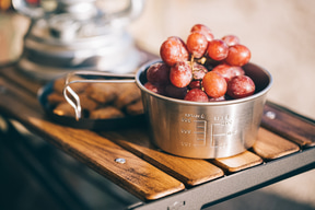 金物の町・燕三条で製造した。50mL~250mLの50mLごとの目盛りと、お米0.5~1合を計れる90mLごとの目盛りを備える。コップや食器、計量カップ、調理器具として使用できる。