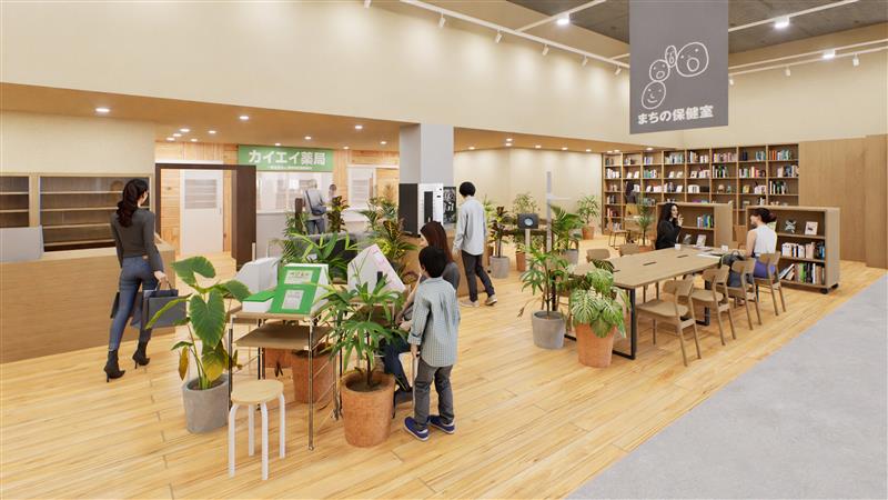 また、地域行政や医療と連携して「まちの保健室」を提供。テーブルやソファ、コーヒーマシン、図書コーナー、計測機器を設置するほか、常駐する薬剤師・登録販売者が、健康相談なども受け、必要に応じて漢方薬の販売も行なう。隣接する「カイエイ薬局」では処方薬を受け取れるほか、「まちの保健室」が開催する講座にも協力する。