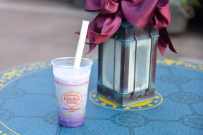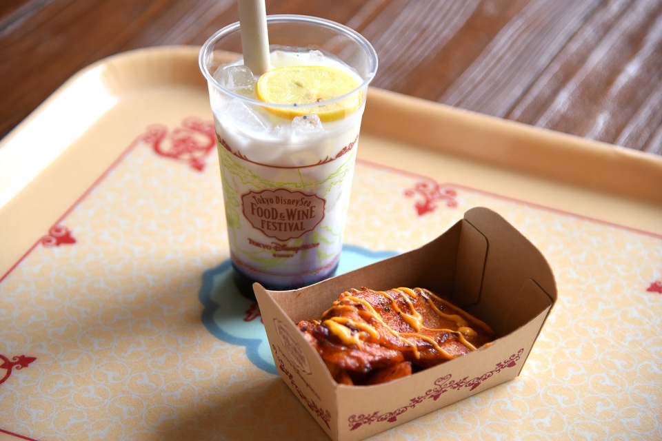 7つのテーマポートを巡るとさらにイベントが楽しくなるとのことで、続いてアラビアンコーストへ。「カスバ・フードコート」にて「チーズソースのタンドーリチキン」(650円)をチケットで、そして「スペシャルラッシー(バタフライピー&レモン)」(700円)も購入してみた。