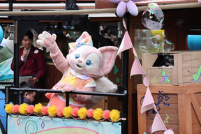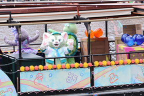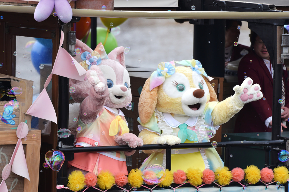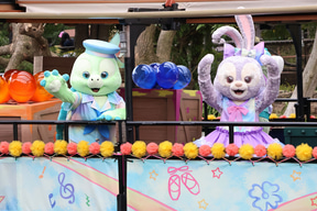 トランジェットスチーマーラインからは、ダッフィー&フレンズ20周年の「カラフルハピネス」のストーリーをイメージした虹色のシャボン玉がたくさん出て、日が差すとダッフィーたちのまわりや通ったあとがキラキラと光って幻想的。ハッピーな音楽とともにまわりをパッと明るくしてくれる。