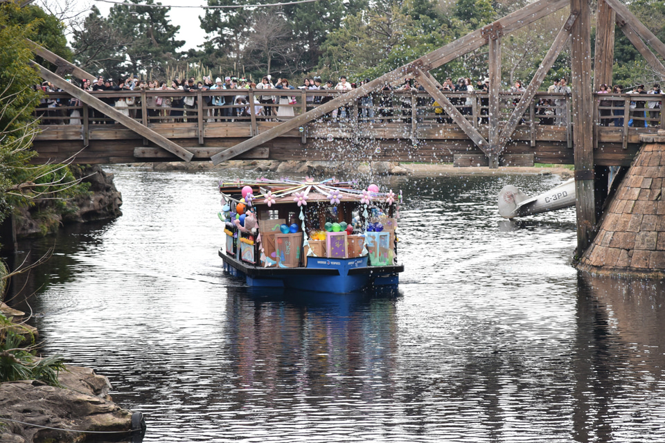 パーク内の水路のほとんどをめぐり、回数も1日2~3回行なうため、どこかで偶然遭遇するチャンスもありそうだ。広いメディテレーニアンハーバーよりも、水路が狭いロストリバーデルタやマーメイドラグーンの方が近くから見えそうだ。橋の上は特等席。