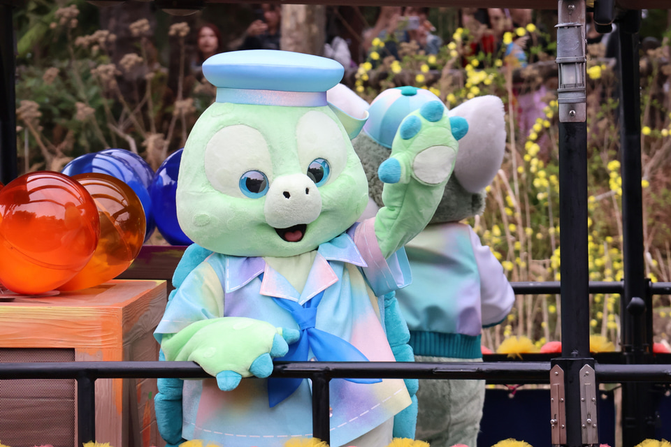 ダッフィーたちは基本的に船の定位置から動かないので、推しのキャラクターと逆側でよく見えなかったときは、少し先回りして進行方向の逆側に回ってみよう。進行方向右側面がリーナ・ベル、ステラ・ルー、オル・メルの3人、左側面にクッキー・アンとジェラトーニがいて、船の後方にダッフィーとシェリーメイが乗船している。