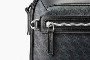 ブランドロゴをモノグラムパターンで施したPVC生地に牛革を組み合わせた黒基調のデザインで、ファスナー部にはYKKのアルミ合金製「エクセラライト」を採用、引き手はゼロハリバートンのロゴを型押しした革製になっている。