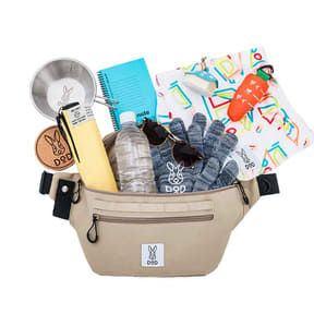 ファミマ限定「DOD」多機能ボディバッグ、ガバッと開いて中身が見やすく収納力あり。ベージュ/ブラック