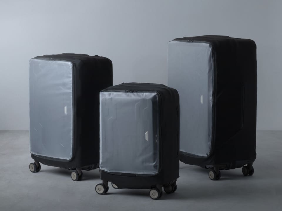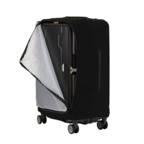 フロントオープンタイプの利便性と、保護機能維持の両立を目指した、上から被せるタイプのカバー。スーツケース前面部にファスナーで開閉する窓を備える作りで、カバーをずらしたり外したりすることなくフロントオープン部にアクセスできる。
