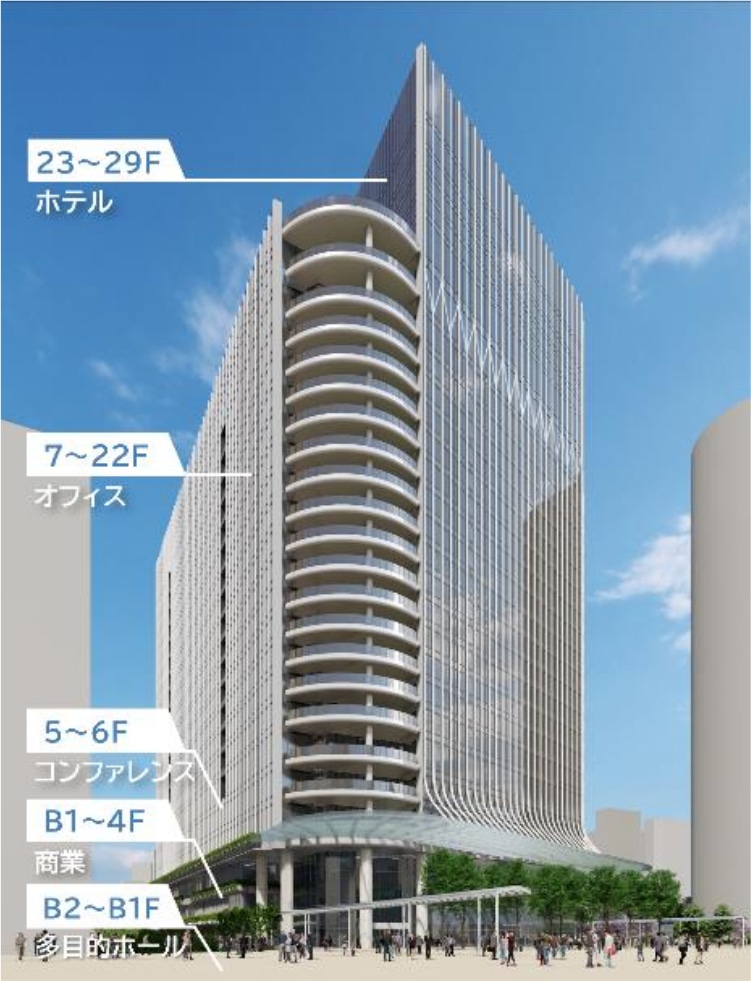 国内最大級のフロア面積を持つオフィス(7~11階)や都心最大規模のコンファレンス(5~6階)をはじめ、地下1~2階には多目的ホール、地下1~4階には商業施設、23~29階にはホテルが入居する。