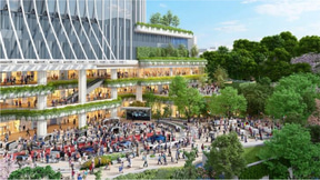 建物周辺の屋外には、豊かな緑に囲まれたベンチや桜・石垣を活用した歩行者空間、大規模なイベントを開催できる広場も整備するとのこと。
