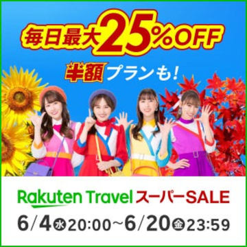 楽天トラベルは、夏の旅行予約がお得な「楽天トラベル スーパーSALE」を6月20日まで開催している。全国の宿泊施設が掲載プランから最大25%オフになるほか、楽パック(JR/航空+宿)やテーマパーク提携ホテルに使える高額クーポンも登場。