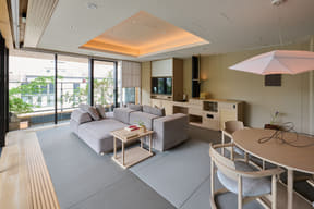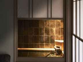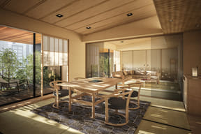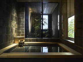 東京メトロ有楽町線 銀座一丁目駅6番出口に直結する新築ビル「(仮称)銀座ビル建替計画」に入居し、地下2階~地上1階、7~12階、屋上階を含む全10フロアで構成。全34室6タイプ(55~160m2)には、日本の四季と美意識を感じられるインテリアを設え、熱海から運んだ天然温泉の客室風呂を備える。