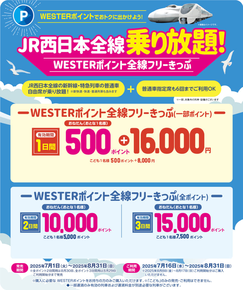 新幹線・特急も乗り放題「WESTERポイント全線フリーきっぷ」夏も発売。新たに1日/2日/3日間有効