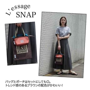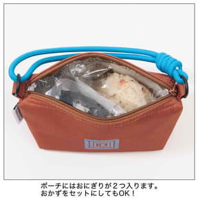 おにぎりポーチはバッグに入れてもかさばらないコンパクトサイズで、約16×7×8.5cm(幅×奥行き×高さ)。おかずやおやつ入れるのもお勧めという。ロープ紐をアクセントにしたデザインとトレンド感のある配色は、トートとセットで使用してもお洒落。