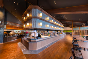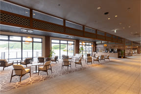 紀伊半島の南東端に立地し、館内のいたるところから勝浦湾の絶景を望むロケーションを活かした和の温泉リゾート。宿泊料金内に食事や夕食時のアルコール、施設内サービスの利用料金がほぼ含まれる料金形態「オールインクルーシブ」を採用しており、ロビーのラウンジではドリンクや夜食が無料。海へ突き出すような造りのデッキラウンジにドリンクを運んで目の前に広がるオーシャンビューを眺めながらくつろぐこともできる。