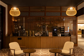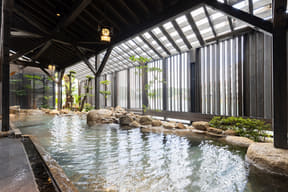 海に面した温泉は、2か所あった貸切風呂を1つの露天風呂(男女入替制)にリニューアル。既存の大浴場はダークトーンでシックなデザインに新装し、洗い場に仕切りを設けてより快適に。また、湯上りラウンジも新設した。