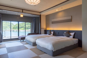 客室は露天風呂付客室や和室、洋室、和洋室など多彩なタイプがあり、ほぼすべてがオーシャンビュー。またリブランドを機に、一部客室は和ベッドルームにリノベーションしている。