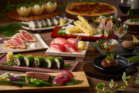 夕食は、勝浦漁港で水揚げされた生まぐろのお造りや握り寿司、熊野牛入りハンバーグや熊野牛ピザといったご当地牛グルメが並ぶバイキングで、アルコール・ソフトドリンクも飲み放題となる。
